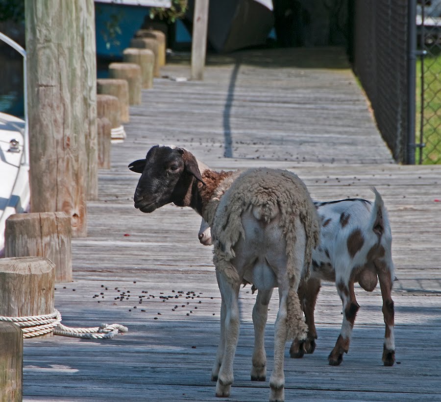 Inseparable four legged buddies invaded my yard three days ago. Despite attempts by the local police and the investigators from the county SPCA, our farm friends remained ensconced in the confines of my back lawn. Hibiscus, petunias and geraniums were the food of choice as local animal advocates searched in vain for the owners of our new found goat and lamb. At a loss for a "safe placement" SPCA officials seemed to shrug and avoid our repeated phone calls.At long last, after watching my flowers being recycled into animal droppings, a friend suggested the DD Bar farm rescue group from eastern LI. The folks from DD Bar Farm arrived promptly and after some impressive "animal whispering" they had one goat in hand. Mr. Lamb was another story and required several neighbors running in circles as he dodged and sprinted to avoid capture until all parties concerned were exhausted. Eventually we waved farewell as Mr. Goat and his best friend Mr. Lamb headed to their new home.